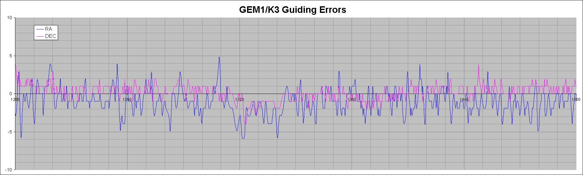 Analyses of Homemade GEM1 Guiding System Finally I had chance to test my homemade GEM1 guiding system. Although seeing conditions were not very good (soft wind), I could not resist an opportunity. I put my Philips Vesta 675SC2 webcam at prime focus of my 8" F6 Newtonian. The resolution of such system is 0.96arcsec/pixel. I selected Altair as guiding star: